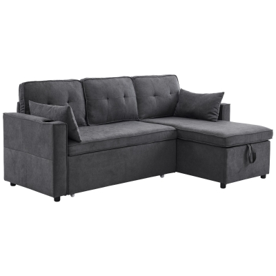 3-in-1 Convertible Sofa Bed with Internal Storage Chaise, L Shaped Sleeper Sofa with Cup Holders and Pillows, 211L x 130W x 86H cm, Grey