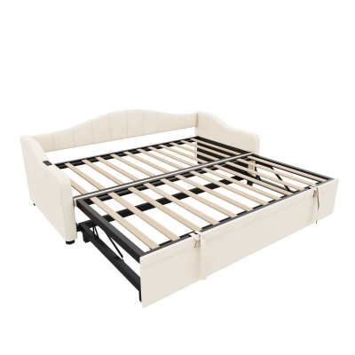 Velvet Upholstered Daybed with USB and Type-C Charging Ports, Convertible Sofa Bed with Pull-Out Trundle, 202L x 193W x 78H cm, Beige