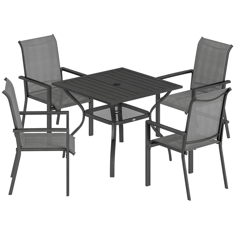 Outsunny 5 Pieces Outdoor Dining Set for 4, Garden Table and Stackable Chairs with Breathable Mesh Seat and Parasol Hole, Grey(m-8)