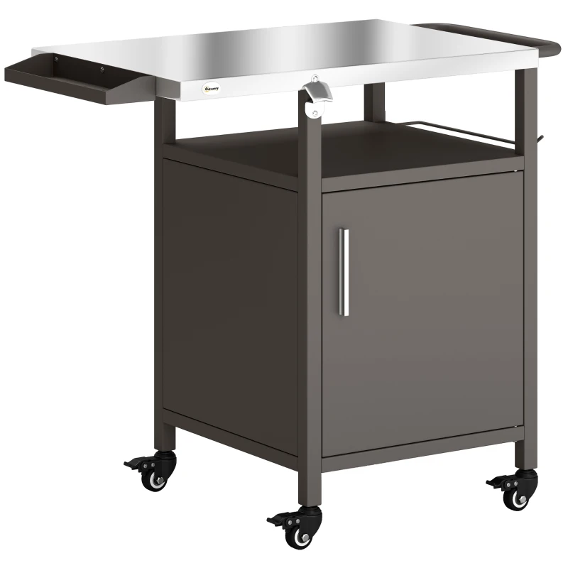 Outsunny Grill Cart with Stainless Steel Top, Pizza Oven Stand with Cabinet, Spice Rack, Towel Holder, Bottle Opener, Brown