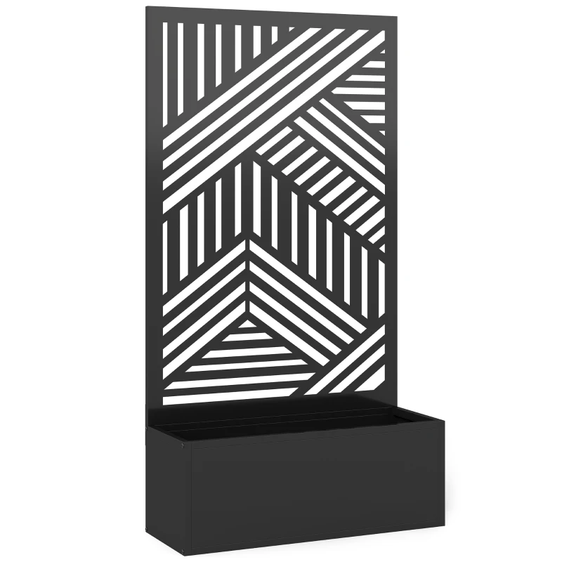 • Duo design: Merging a raised flower bed, with a geometric slatted cut-out pattern back trellis that doubles as a climbing support and a natural privacy screen - room for plants and flowers, with the back for a natural greeny wall.