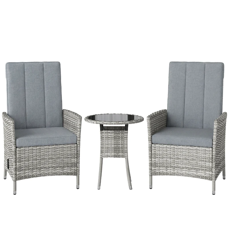 Outsunny Rattan Bistro Set, Reclining Garden Chairs and Glass Coffee Table with Cushions for Patio Balcony Porch, Light Grey(m-11)
