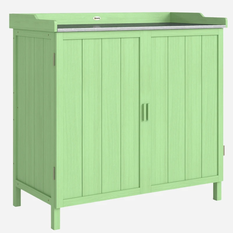 Outsunny Wood Garden Storage Cabinet, Outdoor Tool Shed, Potting Bench Table with galvanised Top and Two Shelves for garden Tools or Pool Accessories, Green